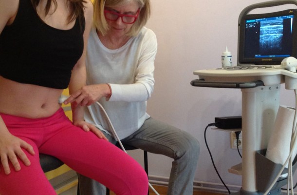 Η επανεκπαίδευση σταθεροποίησης της οσφυο-πυελικης περιοχής είναι πολύ απλά η προσπάθεια επανάκτησης του ελέγχου και της δράσης των σταθεροποιών εν τω βάθει μυών δημιουργώντας ένα φυσικό κορσέ στην περιοχή. Η συνειδητοποίηση αυτών των μυών αποτελεί και το δυσκολότερο κομμάτι του προγράμματος. Η υπερηχογραφική απεικόνιση είναι ένας τρόπος μοναδικής ακρίβειας για να παρατηρήσουμε αυτούς μύες που βρίσκονται βαθειά στο σώμα μας και να δούμε αν λειτουργούν σωστά. Πρόκειται για μία ασφαλή και αποτελεσματική μέθοδο αξιολόγησης της κίνησης τους η οποία γίνεται σε πραγματικό χρόνο. Ασφαλή ηχητικά κύματα μεταφέρονται από τον υπέρηχο στους μυϊκούς ιστούς και στη συνέχεια, αντανακλάσεις τους συλλέγονται και εμφανίζονται σαν εικόνες στην οθόνη του υπέρηχου. Οι ασθενείς συνειδητοποιούν αυτούς τους μύες δια μέσου της βιοανάδρασης της εικόνας και έτσι ευκολότερα μαζί με την χειροπρακτική βοήθεια του φυσικοθεραπευτή ο ασθενής αρχίζει να αντιλαμβάνεται και να δραστηριοποιεί τους εν τω βάθει μύες.